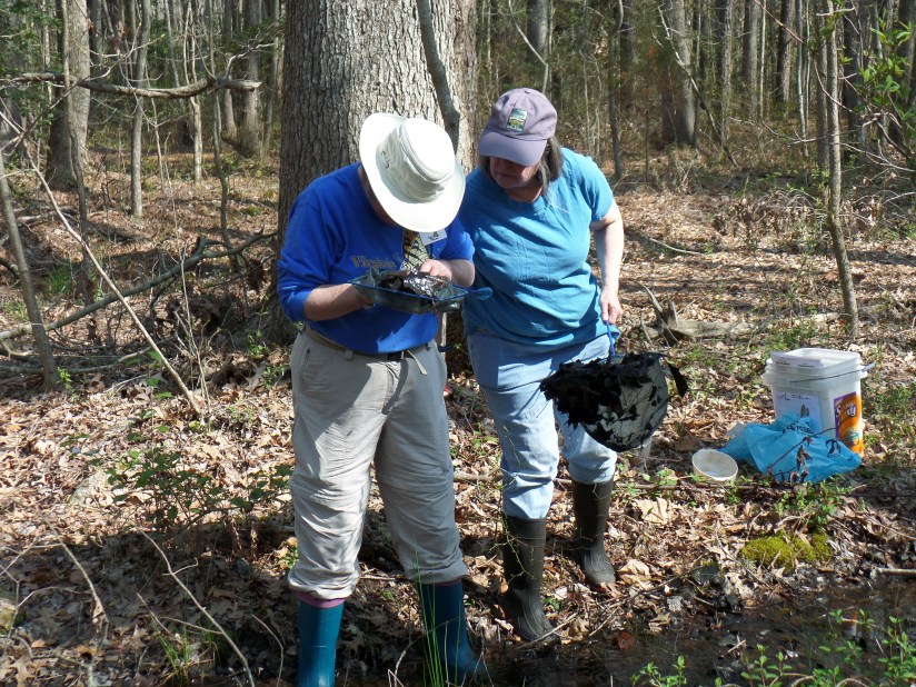 Sherry Rollins took these pictures at Sandy Point State Forest in King William County on April 17, 2023 during vernal pool monitoring. Bill Blair is holding a juvenile turtle that Sherry found in one of the vernal pools. In the second picture, Susan Crockett is measuring Marbled Salamander larvae that Bill netted. They have been visiting the pools once a week since mid-March.