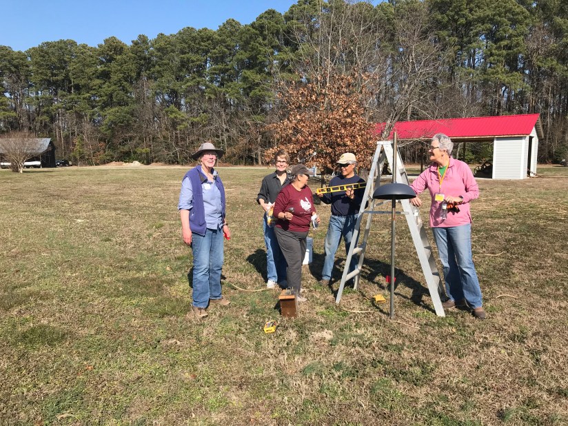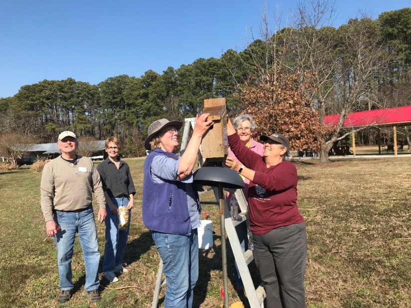 Ten bluebird nest boxes were installed at the Deltaville Maritime Museum at Holly Point Nature Park. On February 12, volunteers with Virginia Master Naturalists – Middle Peninsula Chapter placed poles in the ground and mounted baffles and nest boxes to each. The population of bluebirds dropped as much as 90% decades ago due to habitat loss. Citizens everywhere have been putting up boxes to help their numbers bounce back.