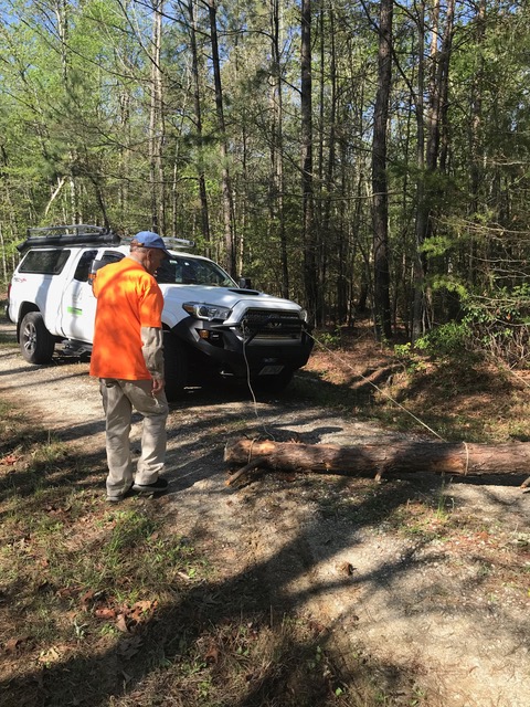 Middle Peninsula Master Naturalists like to be prepared for anything and everything! Enroute to monitor vernal pools, Susan Crockett reported, “We encountered two downed trees across the road at Sandy Point State Forest on Tuesday, April 16. True to form, Bill Blair had a hatchet and bow saw in his truck and went to work on the biggest tree with Tom Cowdrey’s help. The second tree was smaller so Tom, Jan and I were able to drag it out of the way. Bill promises to have his chain saw in the truck for the next SPSF visit!”